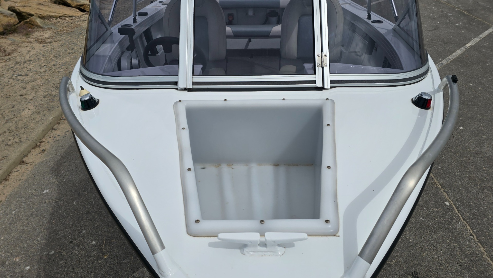 Fire extinguisher, 2 paddles, waterproof torch, inshore flares, bucket and lanyard, 4 inflatable life jackets, 2 fenders, engine flushers, anchor with rope and chain, and VHF radio with aerial.